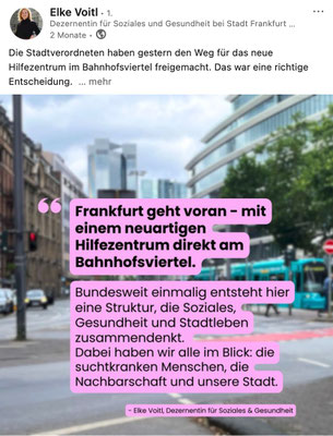 Nachhaltig gemeinwesengestaltende Sozialpolitik für eine Großstadt wie Frankfurt ist mit diesem Selbstverständnis kaum mehr zu machen. Bestes Beispiel dafür: Die politischen und öffentlichen Auseinandersetzungen um das geplante und mittlerweile beschlossene Suchthilfezentrum für Schwerstsabhängige im Frankfurter Bahnhofsviertel.